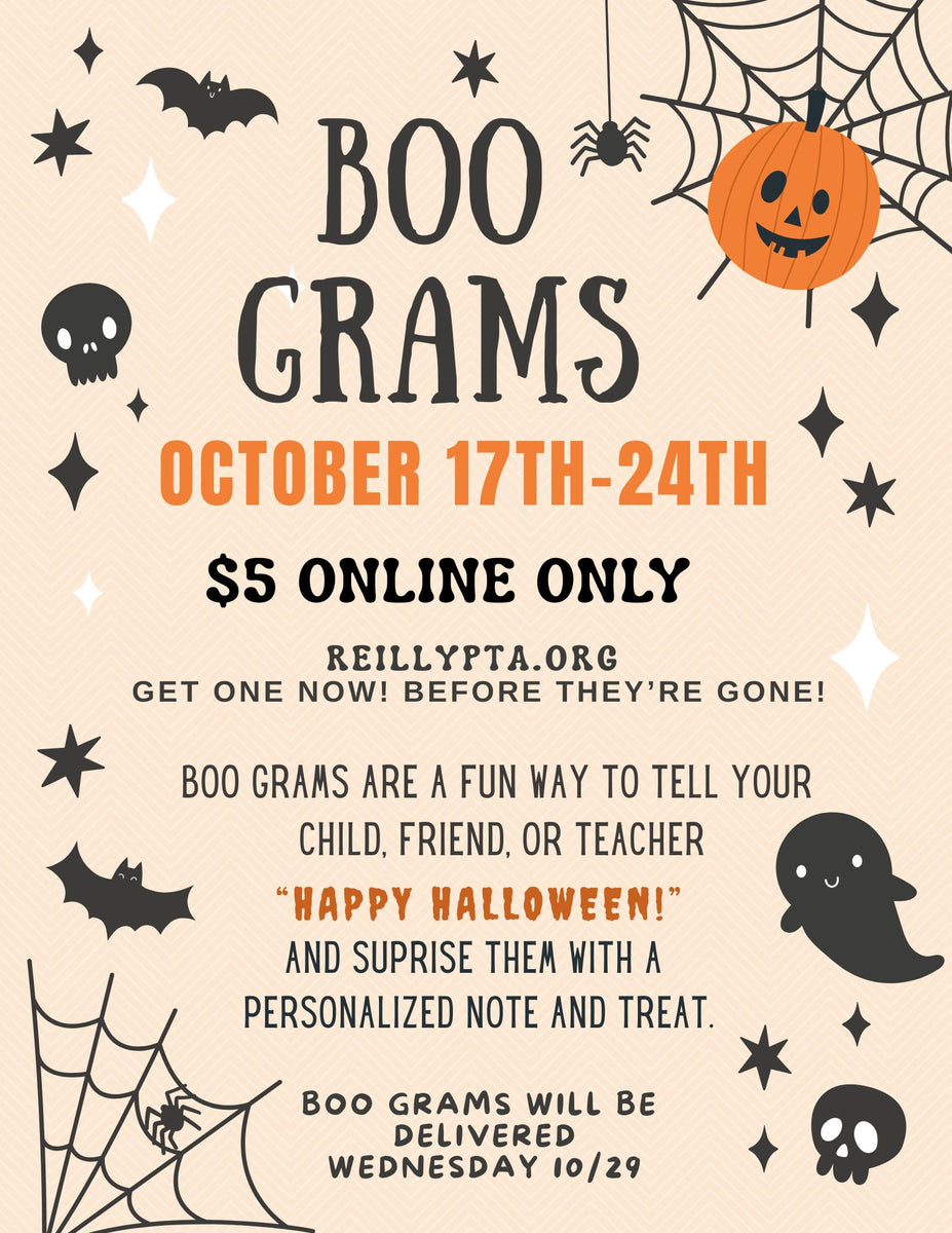 Boo Grams are only available for purchase online from 10/17- 10/24 and will be distributed to the classrooms by 10/29